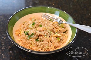 - Pour the GF soy sauce evenly over the rice mixture and and stir for a minute. Serve immediately.
